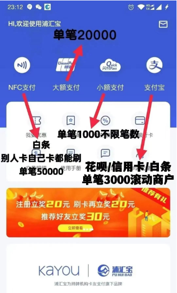 提醒:瀚汇通限额单笔2万,单日5万;新用户注册24小时内只能刷卡三笔,超过三笔会交易失败。(刷脸支付不支持的卡可以用在线支付)刷卡费率:小额0.38%+3,大额0.6%+3;